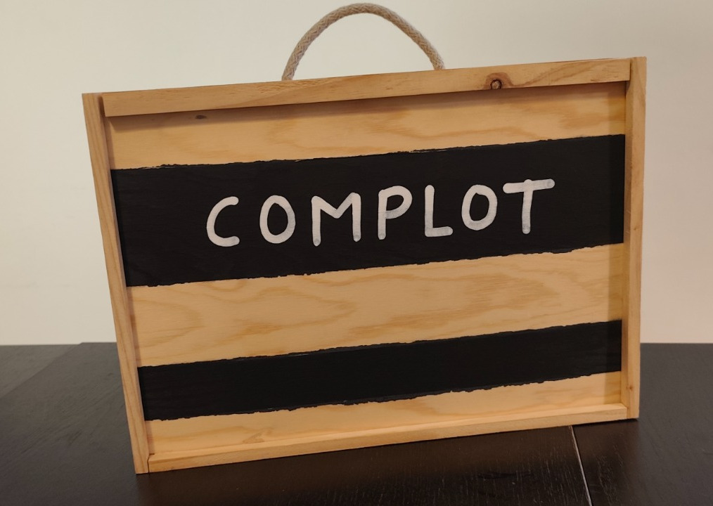 Complot es un poema objeto compuesto por 27 las letras de un teclado desechado dentro de una caja de aceites de oliva intervenida, realizado en Madrid en los primeros meses de 2025.
