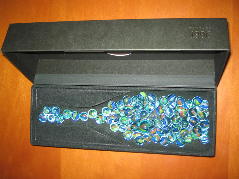 Objeto divertido a partir de canicas de vidrio y una caja de botella de vino de alta gama. El año 2008 se lo regalé a Juan José de la Rosa, después de exponerlo en la Asociación Cultural Clave 53.
