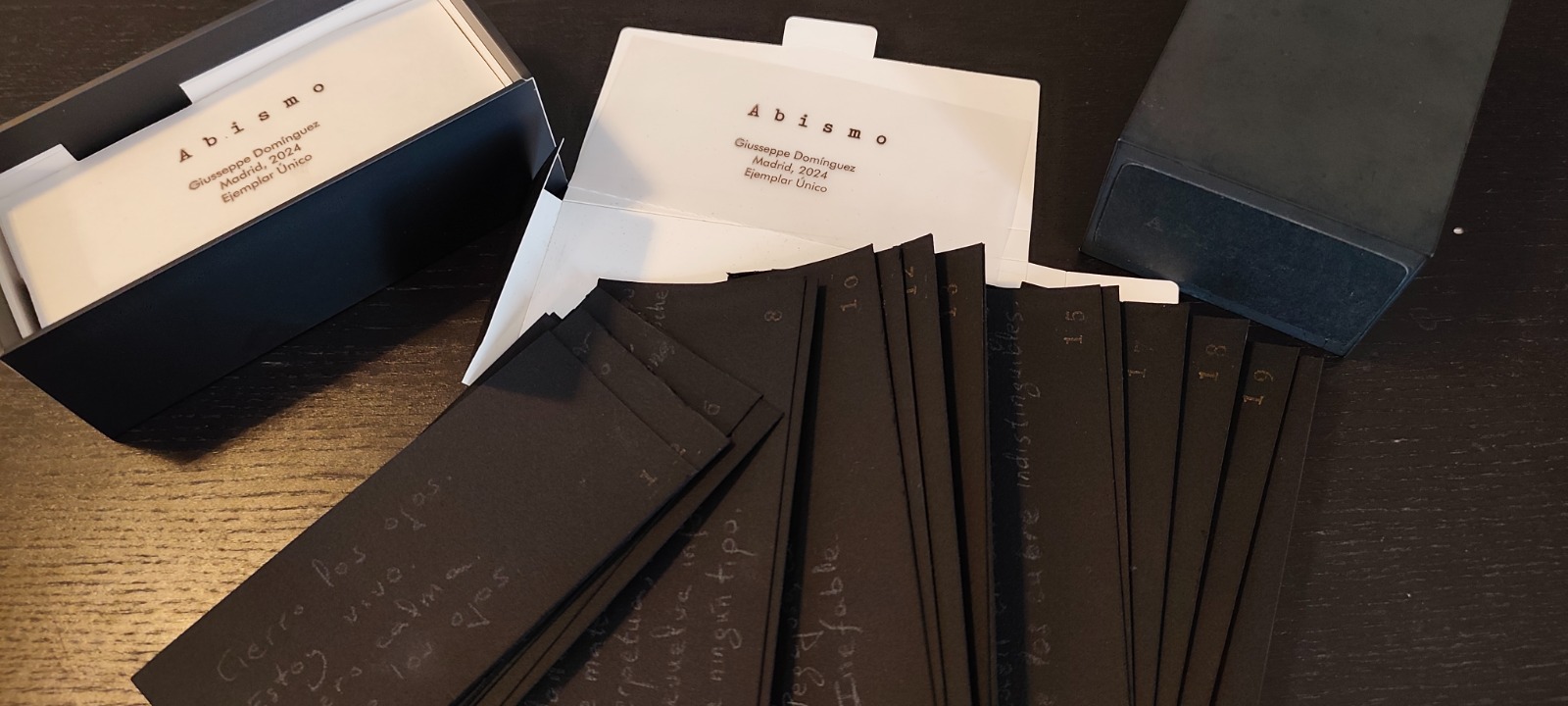 Abismo es un libro objeto de poemas escritos en negro sobre negro, dentro de un envoltorio negro, tratando sobre la negritud.