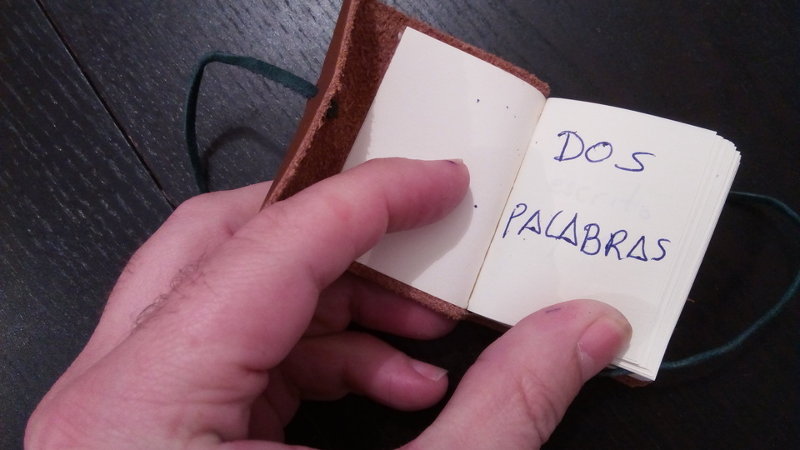 Libro objeto, de pequeño tamaño, escrito con 2 palabras por página, escrito con Bic azul 1,6mm.