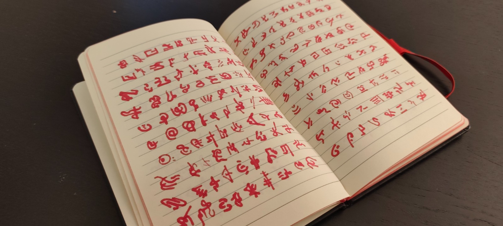 Páginas de Sangre es un Libro Objeto conteniendo 40 páginas de escritura asémica escrita en rojo.