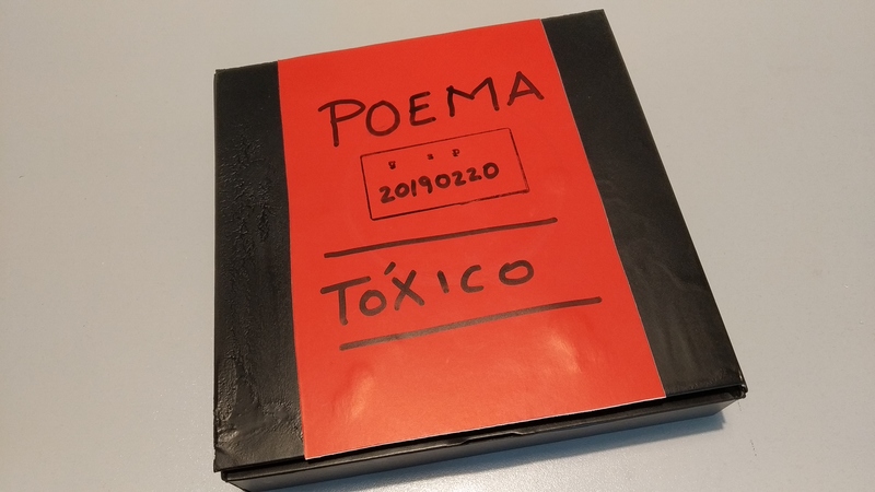 Poema Tóxico está escrito sobre 27 protectores adhesivo de sobres postales dentro de una caja de bombones.