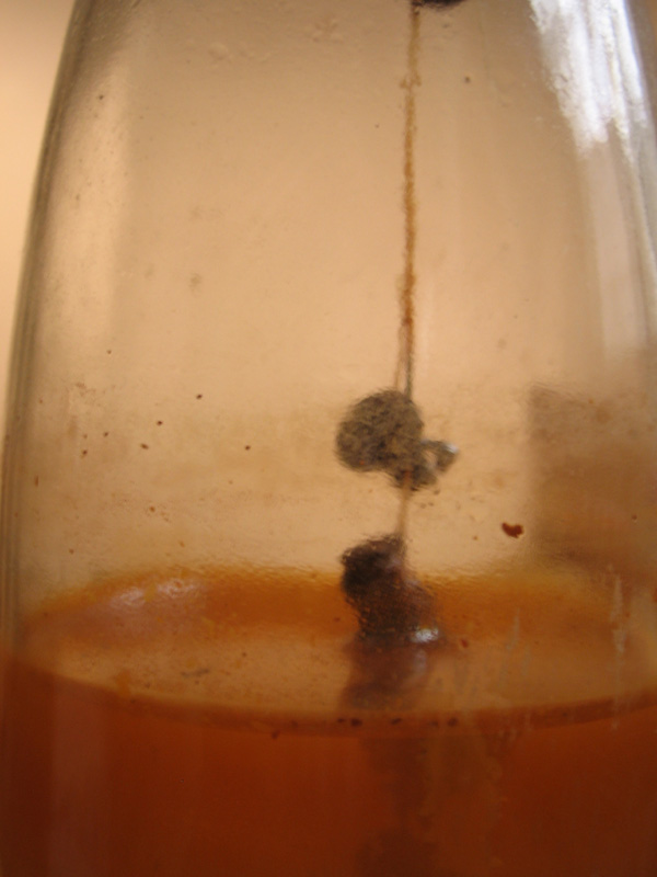 Cuando dentro de una botella se meten unos tornillos anudados y anidan por varios años, el líquido varía, la botella no es ya la de un bodegón sino la efímera demostración de que el tiempo pasa. Poema objetual que tuvo un tiempo de gestación o vida entre 2005 y 2008.